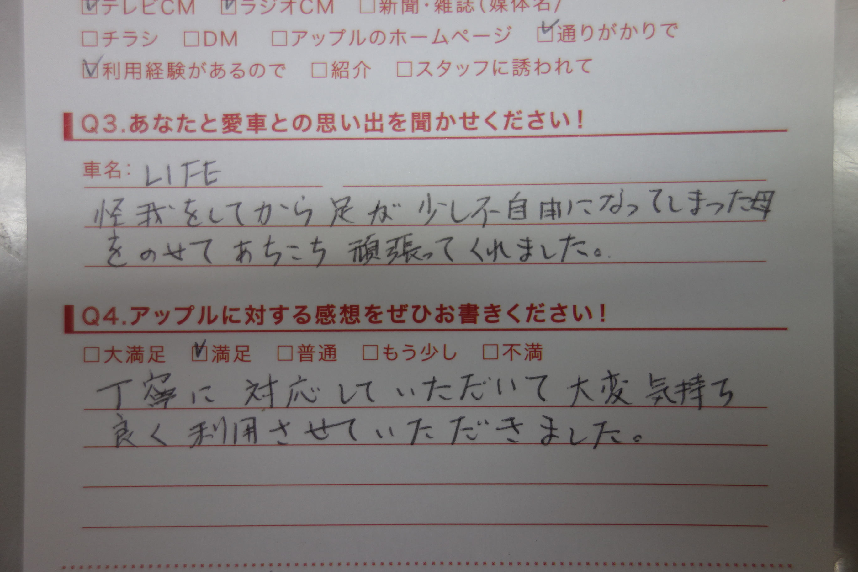 お車のご相談・ 査定だけでもOK! カンタン 入力 30秒 アップルがブランド買取始めました! お電話でも受付中! 受付時間10:00 ~ 19:00 0265-52-4040 お車のご相談・ 査定だけでもOK! カンタン 入力 30秒 アップルがブランド買取始めました! お電話でも受付中! 受付時間10:00 ~ 19:00 0265-52-4040 アップルがブランド買取始めました! お電話でも受付中! 受付時間10:00 ~ 19:00 0265-52-4040 店舗情報 在庫車 スタッフ紹介 ブログ お客様の声 キャンペーン 無料査定 click お客様の声 ご記入日: 2014/12/28 匿名希望K様 車名:ホンダ ライフ 怪我をしてから足が少し不自由になってしまった母をのせてあちこち頑張ってくれました。丁寧に対応していただいて、大変気持ち良く利用させて頂きました。 前へ 次へ お客様の声一覧を見る