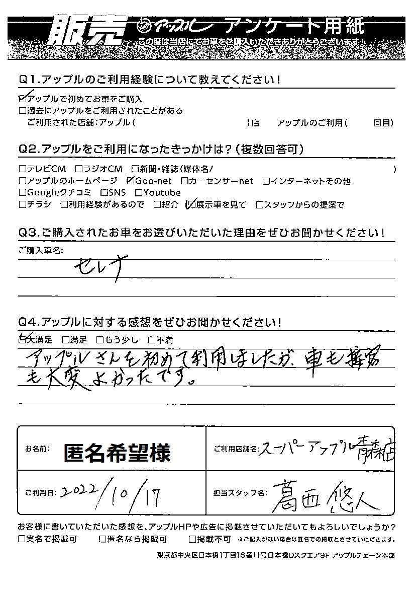 スーパーアップル青森店 お車のご相談・ 査定だけでもOK! カンタン 入力 30秒 アップルがブランド買取始めました! お電話でも受付中! 受付時間9:30 ~ 18:00 017-761-5589 お車のご相談・ 査定だけでもOK! カンタン 入力 30秒 アップルがブランド買取始めました! お電話でも受付中! 受付時間9:30 ~ 18:00 017-761-5589 アップルがブランド買取始めました! お電話でも受付中! 受付時間9:30 ~ 18:00 017-761-5589 店舗情報 在庫車 スタッフ紹介 ブログ お客様の声 キャンペーン 無料査定 click お客様の声 ご記入日: 2022/10/17 匿名希望様 車名:日産 セレナ Q:アップルに対する感想をぜひお聞かせください!大満足アップルさんを初めて利用しましたが、車も接客も大変よかったです。 前へ 次へ お客様の声一覧を見る