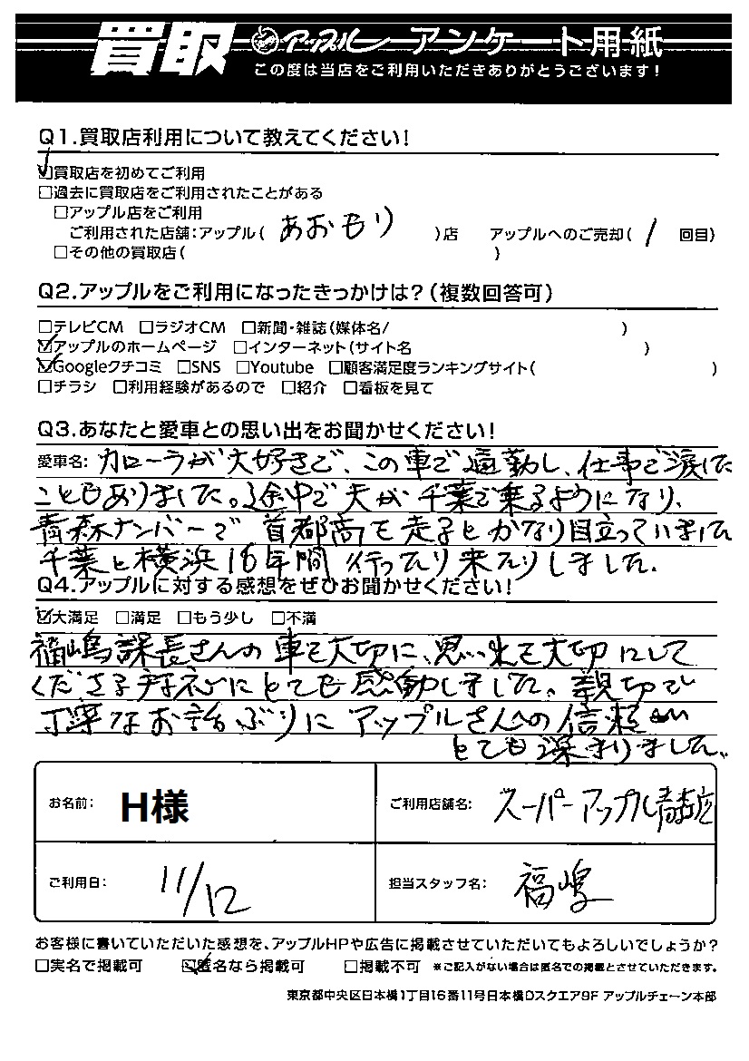 福嶋課長さんの車を大切に、思い出を大切にしてくださる対応にとても感動しました。親切で丁寧なお話しぶりにアップルさんへの信頼 とても深まりました。