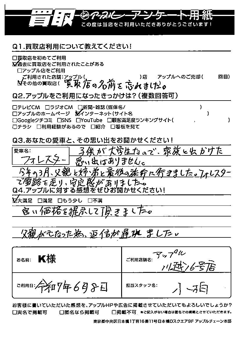 良い価格を提示して頂きました。父親が亡くなった為、返信が遅れました。