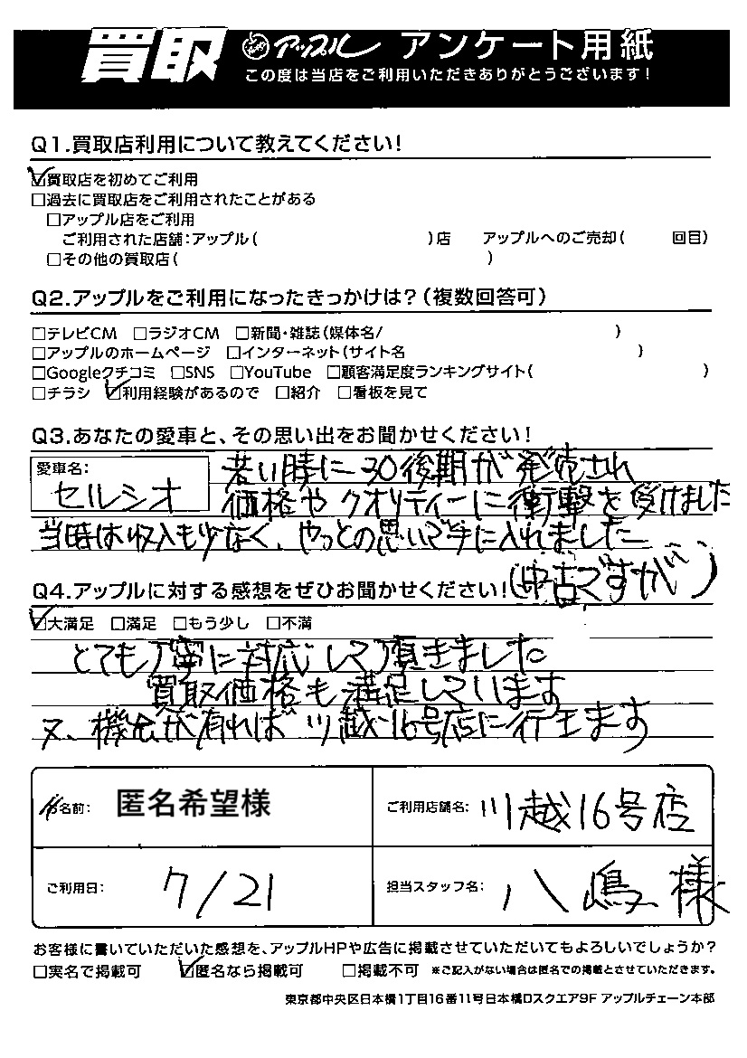 とても丁寧に対応して頂きました。買取価格も満足しています。又、機会が有れば川越16号店に行きます。
