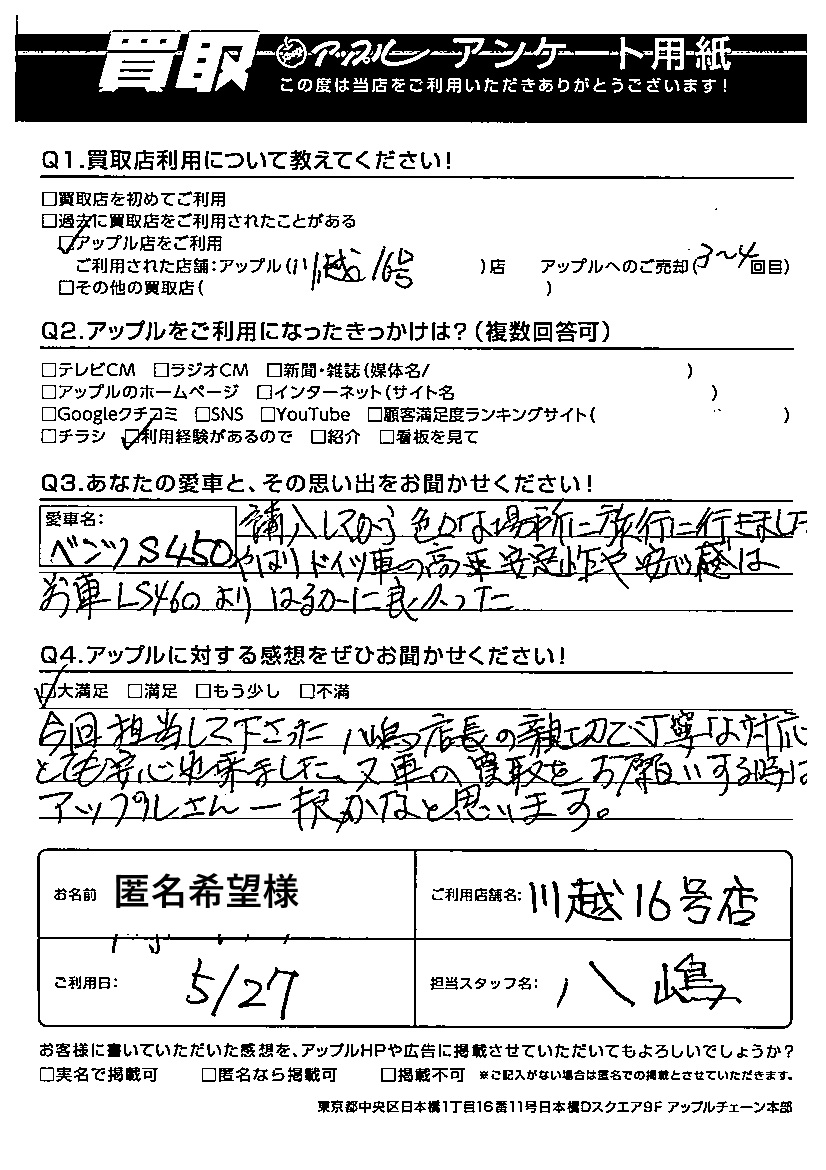 今回担当して下さった八嶋店長の親切で丁寧な対応にとても安心出来ました。又 車の買取をお願いする時はアップルさん一択かなと思います。