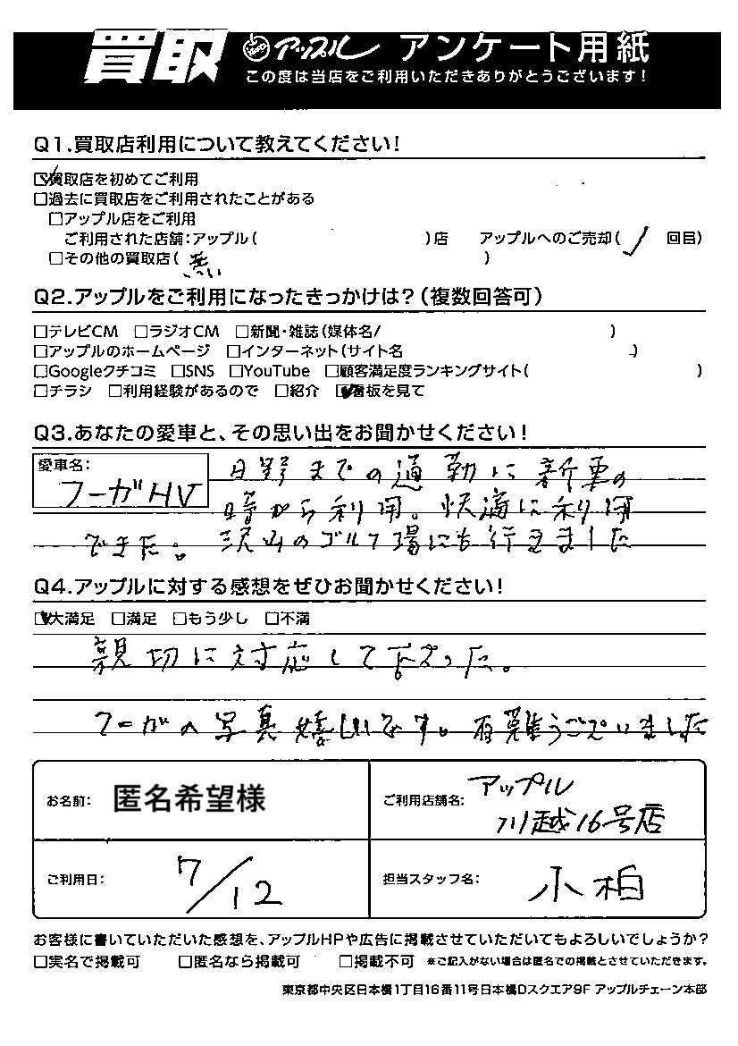 親切に対応して下さった。フーガの写真嬉しいです。有難うございました。