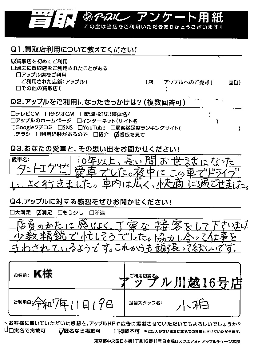 K様 車名:ダイハツ タントエグゼ