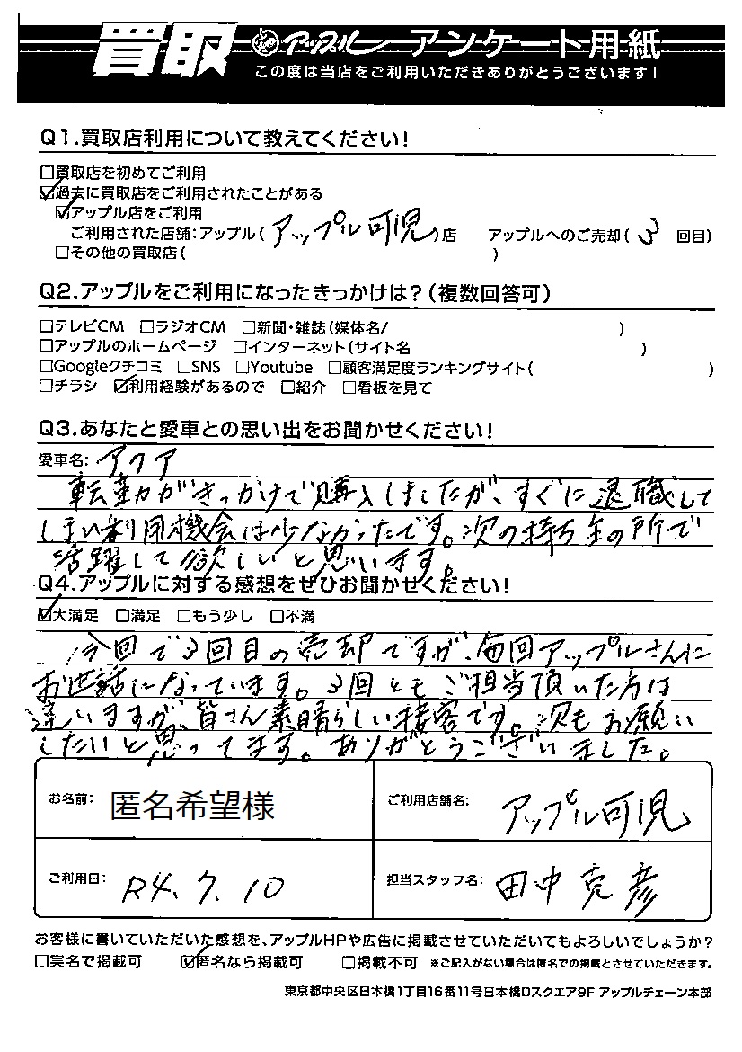 今回3回目の売却ですが、毎回アップルさんにお世話になっています。