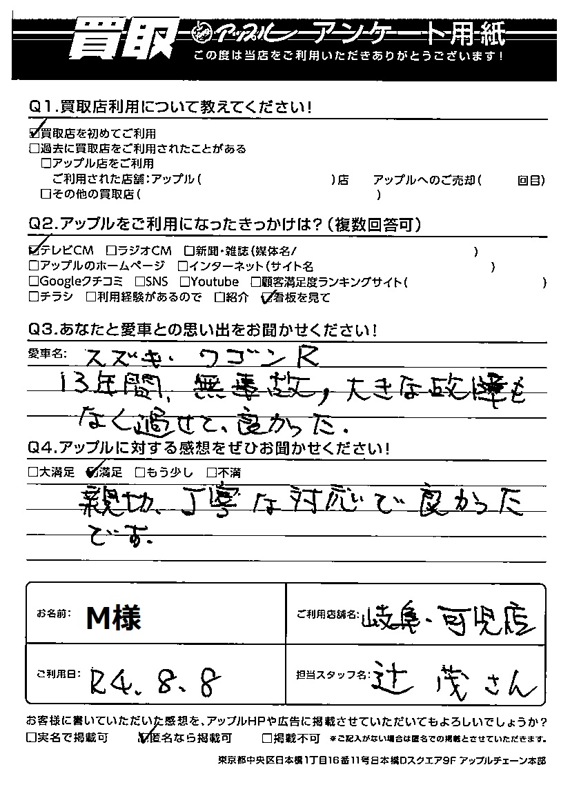 お車のご相談・ 査定だけでもOK! カンタン 入力 30秒 アップルがブランド買取始めました! お電話でも受付中! 受付時間10:00 ~ 19:00 0574-62-6161 お車のご相談・ 査定だけでもOK! カンタン 入力 30秒 アップルがブランド買取始めました! お電話でも受付中! 受付時間10:00 ~ 19:00 0574-62-6161 アップルがブランド買取始めました! お電話でも受付中! 受付時間10:00 ~ 19:00 0574-62-6161 店舗情報 在庫車 スタッフ紹介 ブログ お客様の声 キャンペーン お得 無料査定 click お客様の声 ご記入日: 2022/08/08 M様 車名:スズキ ワゴンR Q あなたと愛車との思い出をお聞かせください!13年間、無事故、大きな故障もなく過せて良かった。Q アップルに対する感想をぜひお聞かせください!感想:満足親切、丁寧な対応で良かったです。 前へ 次へ お客様の声一覧を見る