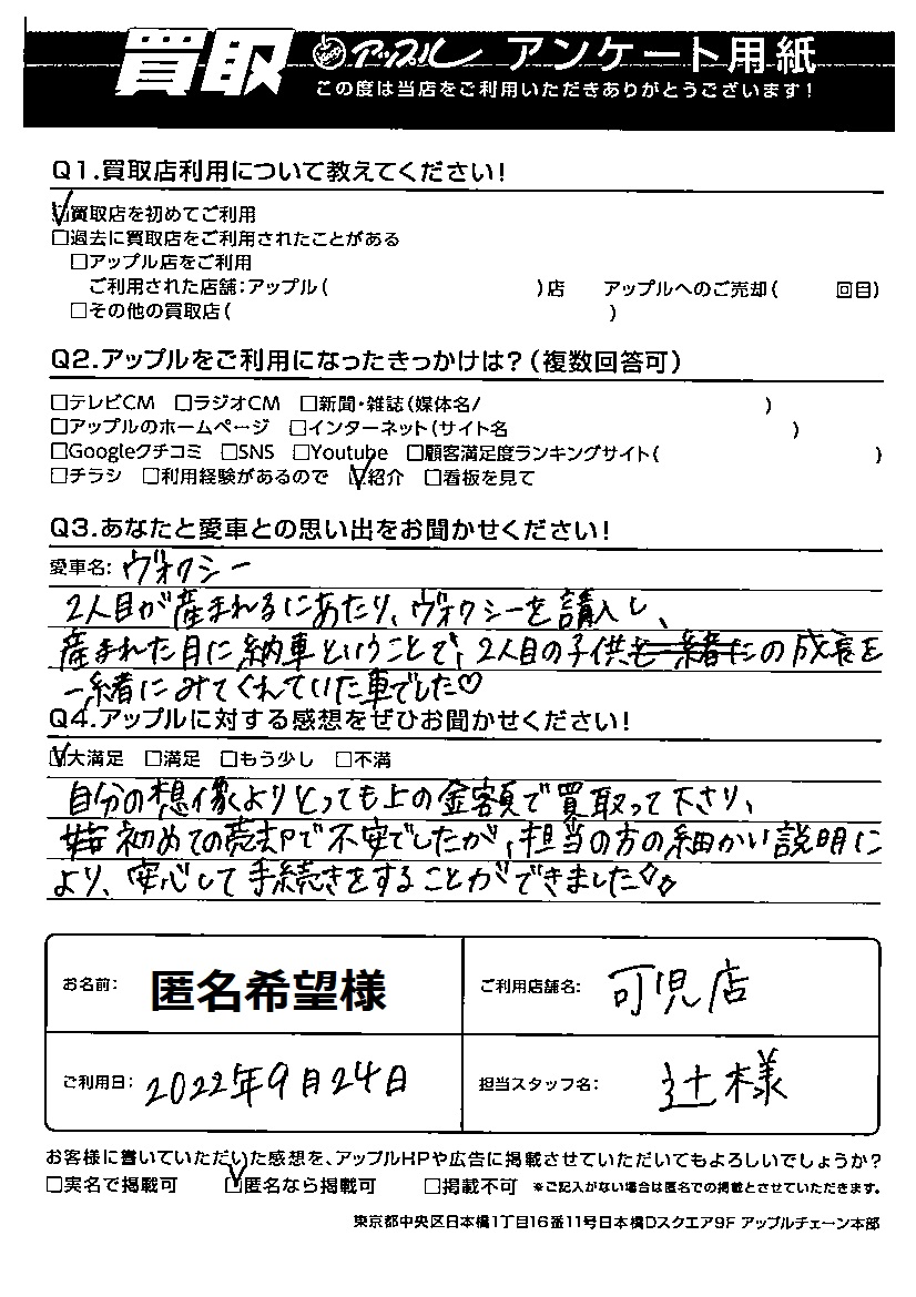 自分の想像よりとっても上の金額で買取って下さり、初めての売却で不安でしたが、担当の方の細かい説明により、安心して手続きをすることができました。