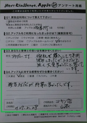 お車のご相談・ 査定だけでもOK! カンタン 入力 30秒 アップルがブランド買取始めました! お電話でも受付中! 受付時間9:30 ~ 18:30 052-735-6411 お車のご相談・ 査定だけでもOK! カンタン 入力 30秒 アップルがブランド買取始めました! お電話でも受付中! 受付時間9:30 ~ 18:30 052-735-6411 アップルがブランド買取始めました! お電話でも受付中! 受付時間9:30 ~ 18:30 052-735-6411 店舗情報 在庫車 スタッフ紹介 ブログ お客様の声 キャンペーン 無料査定 click お客様の声 ご記入日: 2015/02/28 T・K様 ■ご利用日時■ H27年2月28日■車種■ アウディTTクーペ■担当者■ 山本【アップルに対する感想をぜひお書きください】満足度★★★★接客対応が非常に良かったです。 前へ 次へ お客様の声一覧を見る