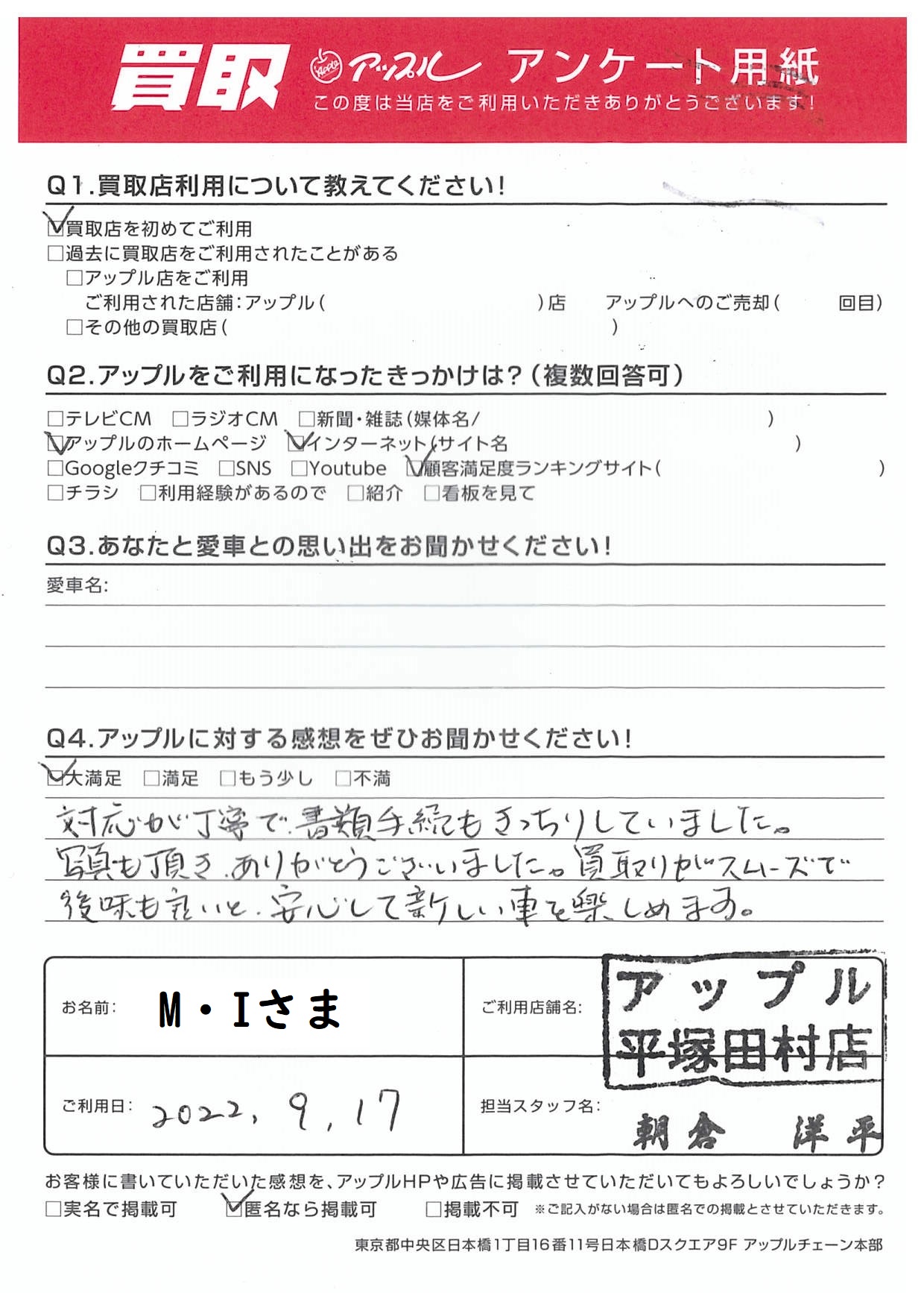 お車のご相談・ 査定だけでもOK! カンタン 入力 30秒 アップルがブランド買取始めました! お電話でも受付中! 受付時間10:00 ~ 19:00 0463-51-1122 お車のご相談・ 査定だけでもOK! カンタン 入力 30秒 アップルがブランド買取始めました! お電話でも受付中! 受付時間10:00 ~ 19:00 0463-51-1122 アップルがブランド買取始めました! お電話でも受付中! 受付時間10:00 ~ 19:00 0463-51-1122 店舗情報 在庫車 スタッフ紹介 ブログ お客様の声 キャンペーン お得 無料査定 click お客様の声 ご記入日: 2022/09/17 神奈川県伊勢原市 M・I様 車名:スズキ スイフト 【アップルに対する感想をぜひお聞かせください!】対応が丁寧で書類手続もきっちりしていました。写真も頂き、ありがとうございました。買取りがスムーズで後味も良いと、安心して新しい車を楽しめます。 前へ 次へ お客様の声一覧を見る
