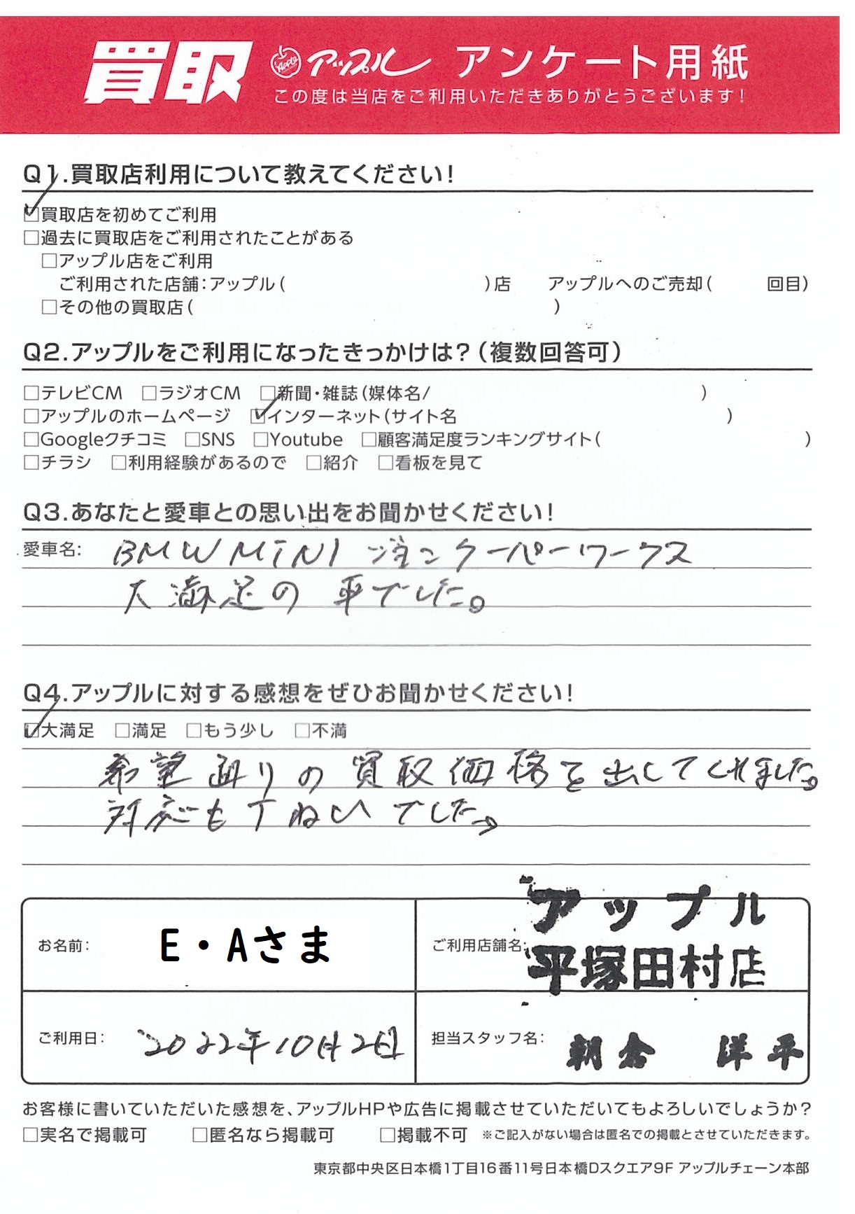 お車のご相談・ 査定だけでもOK! カンタン 入力 30秒 アップルがブランド買取始めました! お電話でも受付中! 受付時間10:00 ~ 19:00 0463-51-1122 お車のご相談・ 査定だけでもOK! カンタン 入力 30秒 アップルがブランド買取始めました! お電話でも受付中! 受付時間10:00 ~ 19:00 0463-51-1122 アップルがブランド買取始めました! お電話でも受付中! 受付時間10:00 ~ 19:00 0463-51-1122 店舗情報 在庫車 スタッフ紹介 ブログ お客様の声 キャンペーン お得 無料査定 click お客様の声 ご記入日: 2022/10/02 神奈川県茅ケ崎市 E・A様 車名:ミニ ミニ 【あなたと愛車との思い出をお聞かせください!】大満足の車でした。【アップルに対する感想をぜひお聞かせください!】希望通りの買取価格を出してくれました。対応も丁寧でした。 前へ 次へ お客様の声一覧を見る