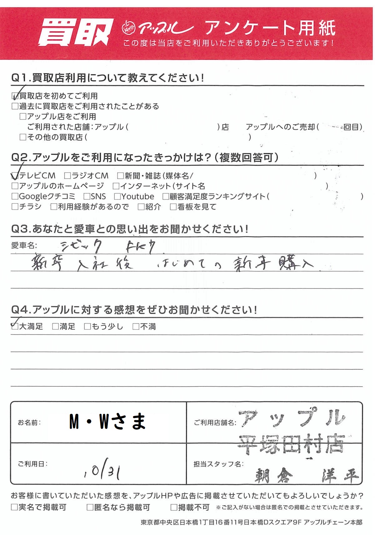 お車のご相談・ 査定だけでもOK! カンタン 入力 30秒 アップルがブランド買取始めました! お電話でも受付中! 受付時間10:00 ~ 19:00 0463-51-1122 お車のご相談・ 査定だけでもOK! カンタン 入力 30秒 アップルがブランド買取始めました! お電話でも受付中! 受付時間10:00 ~ 19:00 0463-51-1122 アップルがブランド買取始めました! お電話でも受付中! 受付時間10:00 ~ 19:00 0463-51-1122 店舗情報 在庫車 スタッフ紹介 ブログ お客様の声 キャンペーン お得 無料査定 click お客様の声 ご記入日: 2022/10/31 神奈川県厚木市 M・W様 車名:ホンダ シビッククーペ 【あなたと愛車との思い出をお聞かせください!】新卒入社後 はじめての新車購入 前へ 次へ お客様の声一覧を見る