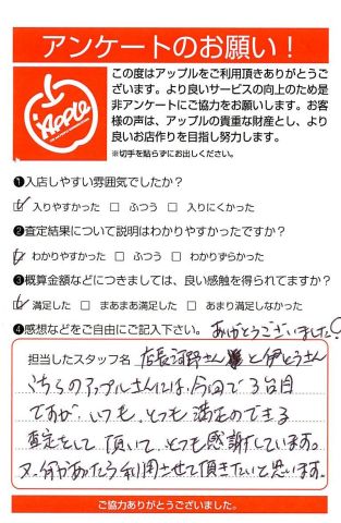 お車のご相談・ 査定だけでもOK! カンタン 入力 30秒 アップルがブランド買取始めました! お電話でも受付中! 受付時間10:00 ~ 19:00 0463-51-1122 お車のご相談・ 査定だけでもOK! カンタン 入力 30秒 アップルがブランド買取始めました! お電話でも受付中! 受付時間10:00 ~ 19:00 0463-51-1122 アップルがブランド買取始めました! お電話でも受付中! 受付時間10:00 ~ 19:00 0463-51-1122 店舗情報 在庫車 スタッフ紹介 ブログ お客様の声 キャンペーン お得 無料査定 click お客様の声 ご記入日: 2018/08/03 フィットシャトル様 こちらのアップルさんは今回で3台目ですが、いつもとても満足のできる査定をして頂いて、とても感謝しています。又、何かあったら利用させて頂きたいと思います。 前へ 次へ お客様の声一覧を見る