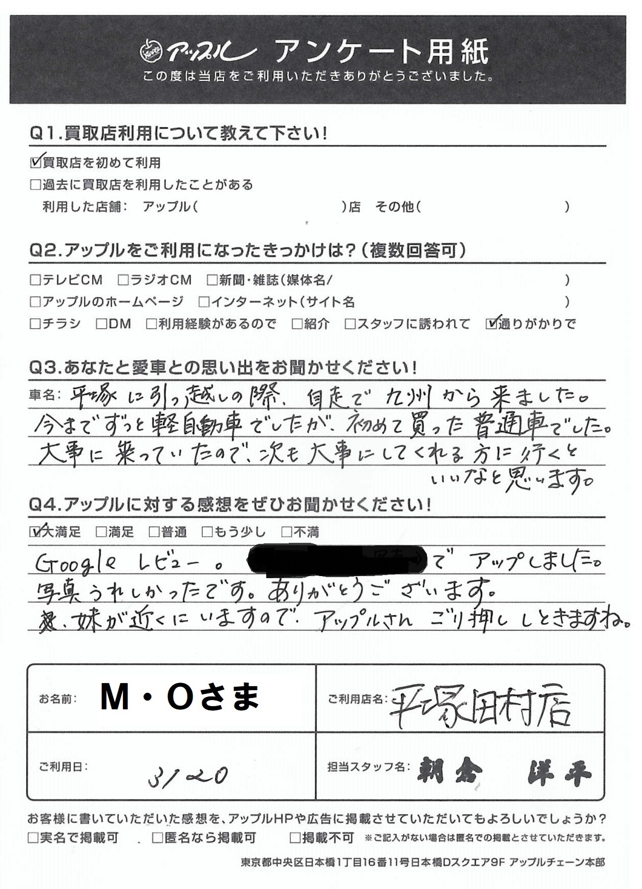 今回はアップル平塚田村店をご利用いただき有難うございます。