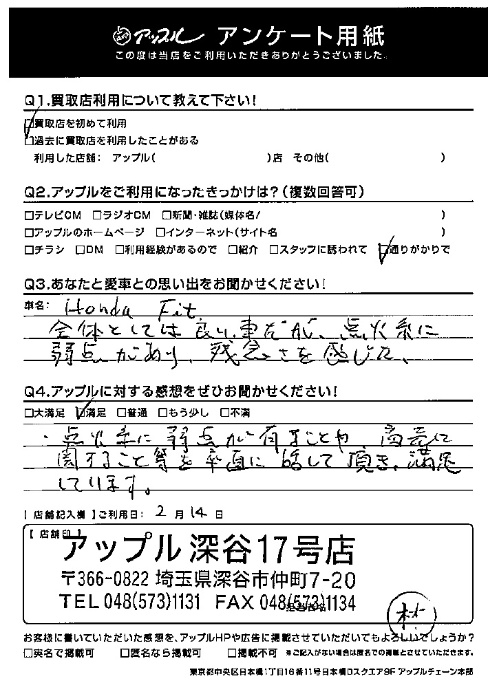 匿名希望様 車名:ホンダ フィット(H25年9月以降のハイブリッド含む)