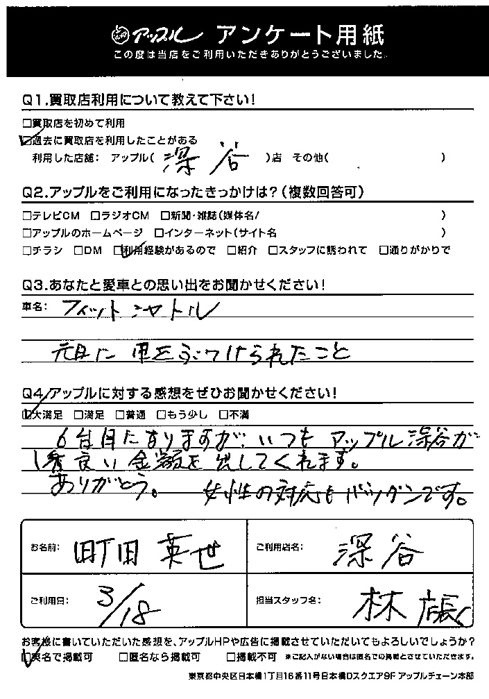6代目になりますが、いつもアップル深谷が1番良い金額を出してくれます。ありがとう。女性の対応もバツグンです。