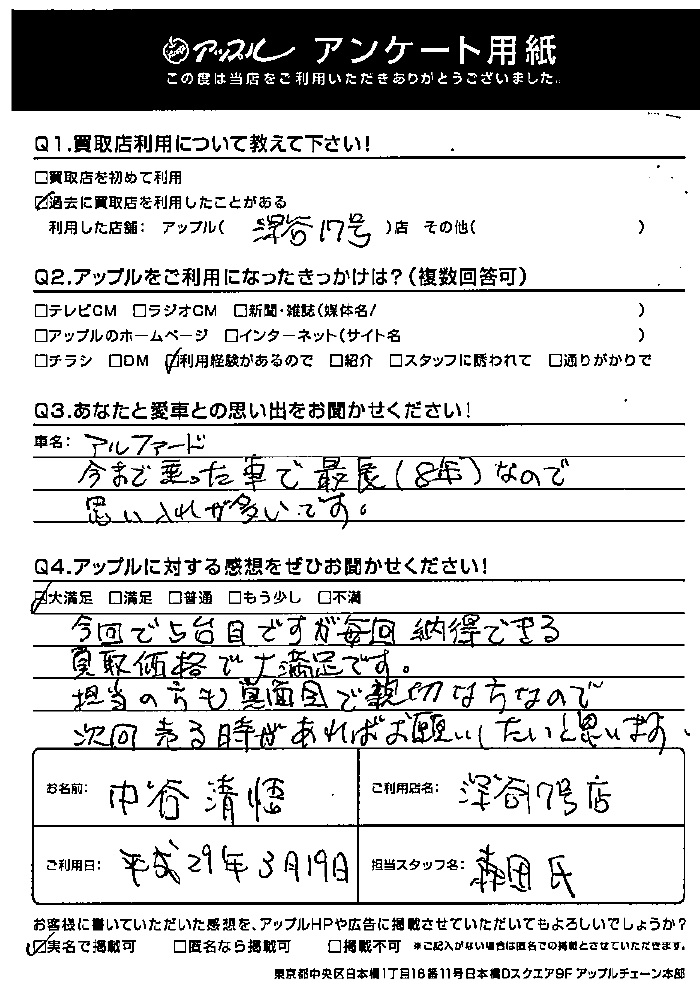 中谷清悟様 車名:トヨタ アルファード(H27年1月~のHYBRID含む)
