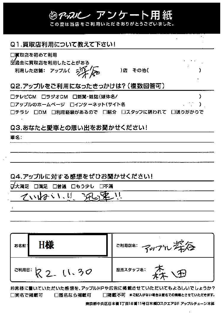 お車のご相談・ 査定だけでもOK! カンタン 入力 30秒 アップルがブランド買取始めました! お電話でも受付中! 受付時間AM10:00~PM7:00 048-573-1131 お車のご相談・ 査定だけでもOK! カンタン 入力 30秒 アップルがブランド買取始めました! お電話でも受付中! 受付時間AM10:00~PM7:00 048-573-1131 アップルがブランド買取始めました! お電話でも受付中! 受付時間AM10:00~PM7:00 048-573-1131 店舗情報 在庫車 スタッフ紹介 ブログ お客様の声 キャンペーン 無料査定 click お客様の声 ご記入日: 2020/11/30 H様 Q:アップルに対する感想をぜひお聞かせください!大満足ていねい!! 迅速!! 前へ 次へ お客様の声一覧を見る