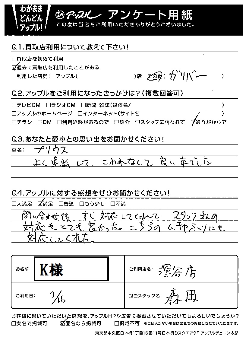 K様 車名:トヨタ プリウス(2023年3月~のPHVを含む)