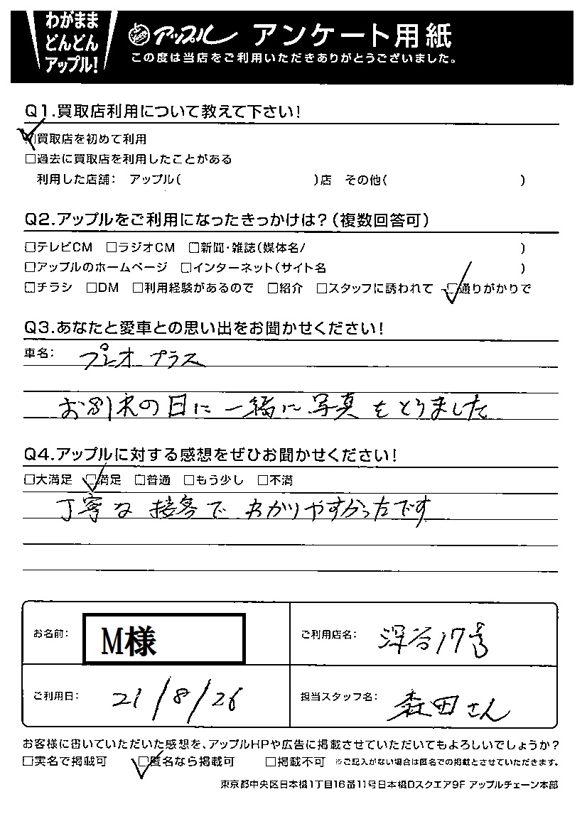 お車のご相談・ 査定だけでもOK! カンタン 入力 30秒 アップルがブランド買取始めました! お電話でも受付中! 受付時間AM10:00~PM7:00 048-573-1131 お車のご相談・ 査定だけでもOK! カンタン 入力 30秒 アップルがブランド買取始めました! お電話でも受付中! 受付時間AM10:00~PM7:00 048-573-1131 アップルがブランド買取始めました! お電話でも受付中! 受付時間AM10:00~PM7:00 048-573-1131 店舗情報 在庫車 スタッフ紹介 ブログ お客様の声 キャンペーン 無料査定 click お客様の声 ご記入日: 2021/08/26 M様 車名:スバル プレオプラス Q あなたと愛車との思い出をお聞かせください!お別れの日に一緒に写真をとりました。Q アップルに対する感想をぜひお聞かせください!感想:満足丁寧な接客でわかりやすかったです。 前へ 次へ お客様の声一覧を見る
