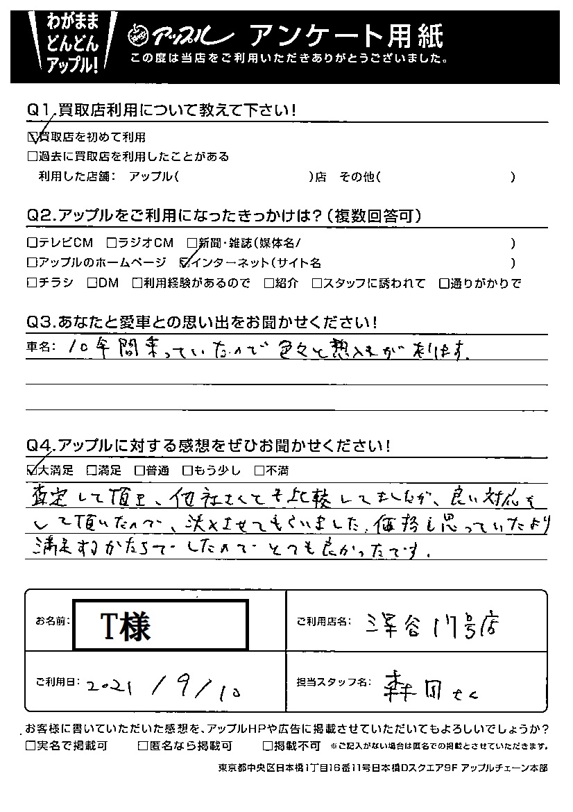 査定して頂き、他社さんとも比較してましたが、良い対応をして頂いたので決めさせてもらいました。価格も思っていたより満足するかたちでしたので、とても良かったです。