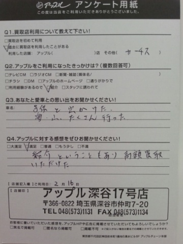 お車のご相談・ 査定だけでもOK! カンタン 入力 30秒 アップルがブランド買取始めました! お電話でも受付中! 受付時間AM10:00~PM7:00 048-573-1131 お車のご相談・ 査定だけでもOK! カンタン 入力 30秒 アップルがブランド買取始めました! お電話でも受付中! 受付時間AM10:00~PM7:00 048-573-1131 アップルがブランド買取始めました! お電話でも受付中! 受付時間AM10:00~PM7:00 048-573-1131 店舗情報 在庫車 スタッフ紹介 ブログ お客様の声 キャンペーン 無料査定 click お客様の声 ご記入日: 2016/02/16 匿名希望様 {愛車との思い出}子供と出かけた。海・山たくさん行った。{アップルに対する感想}紹介ということもあり高額買取いただけた。 前へ 次へ お客様の声一覧を見る