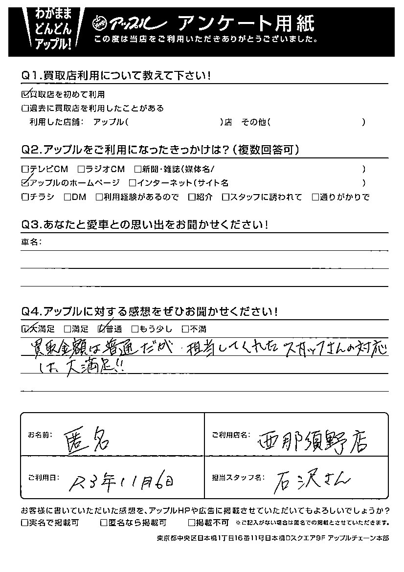 お車のご相談・ 査定だけでもOK! カンタン 入力 30秒 アップルがブランド買取始めました! お電話でも受付中! 受付時間10:00 ~ 19:00 0287-38-0544 お車のご相談・ 査定だけでもOK! カンタン 入力 30秒 アップルがブランド買取始めました! お電話でも受付中! 受付時間10:00 ~ 19:00 0287-38-0544 アップルがブランド買取始めました! お電話でも受付中! 受付時間10:00 ~ 19:00 0287-38-0544 店舗情報 在庫車 スタッフ紹介 ブログ お客様の声 キャンペーン 無料査定 click お客様の声 ご記入日: 2021/11/06 匿名希望様 『アップルに対する感想』大満足 普通買取金額は普通だが、担当してくれたスタッフさんの対応は大満足!! 前へ 次へ お客様の声一覧を見る