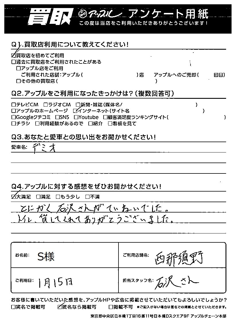 お車のご相談・ 査定だけでもOK! カンタン 入力 30秒 アップルがブランド買取始めました! お電話でも受付中! 受付時間10:00 ~ 19:00 0287-38-0544 お車のご相談・ 査定だけでもOK! カンタン 入力 30秒 アップルがブランド買取始めました! お電話でも受付中! 受付時間10:00 ~ 19:00 0287-38-0544 アップルがブランド買取始めました! お電話でも受付中! 受付時間10:00 ~ 19:00 0287-38-0544 店舗情報 在庫車 スタッフ紹介 ブログ お客様の声 キャンペーン 無料査定 click お客様の声 ご記入日: 2022/01/15 S様 車名:マツダ デミオ 【愛車との思い出】デミオ『アップルに対する感想』大満足とにかく石沢さんがていねいでした。トイレ、貸してくれてありがとうございました。 前へ 次へ お客様の声一覧を見る