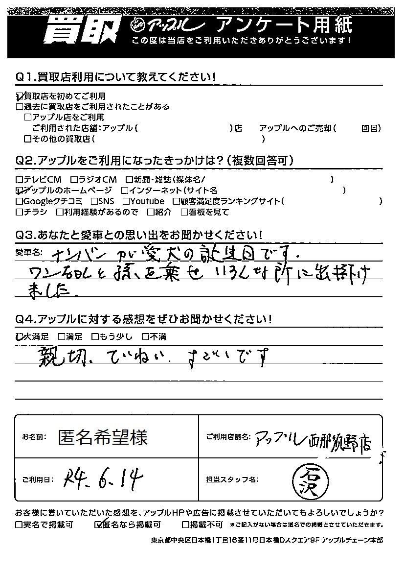 お車のご相談・ 査定だけでもOK! カンタン 入力 30秒 アップルがブランド買取始めました! お電話でも受付中! 受付時間10:00 ~ 19:00 0287-38-0544 お車のご相談・ 査定だけでもOK! カンタン 入力 30秒 アップルがブランド買取始めました! お電話でも受付中! 受付時間10:00 ~ 19:00 0287-38-0544 アップルがブランド買取始めました! お電話でも受付中! 受付時間10:00 ~ 19:00 0287-38-0544 店舗情報 在庫車 スタッフ紹介 ブログ お客様の声 キャンペーン 無料査定 click お客様の声 ご記入日: 2022/06/14 匿名希望様 ナンバーが愛犬の誕生日です。ワンちゃんと孫を乗せいろんな所に出掛けました。『アップルに対する感想』大満足親切、ていねい、すごいです 前へ 次へ お客様の声一覧を見る