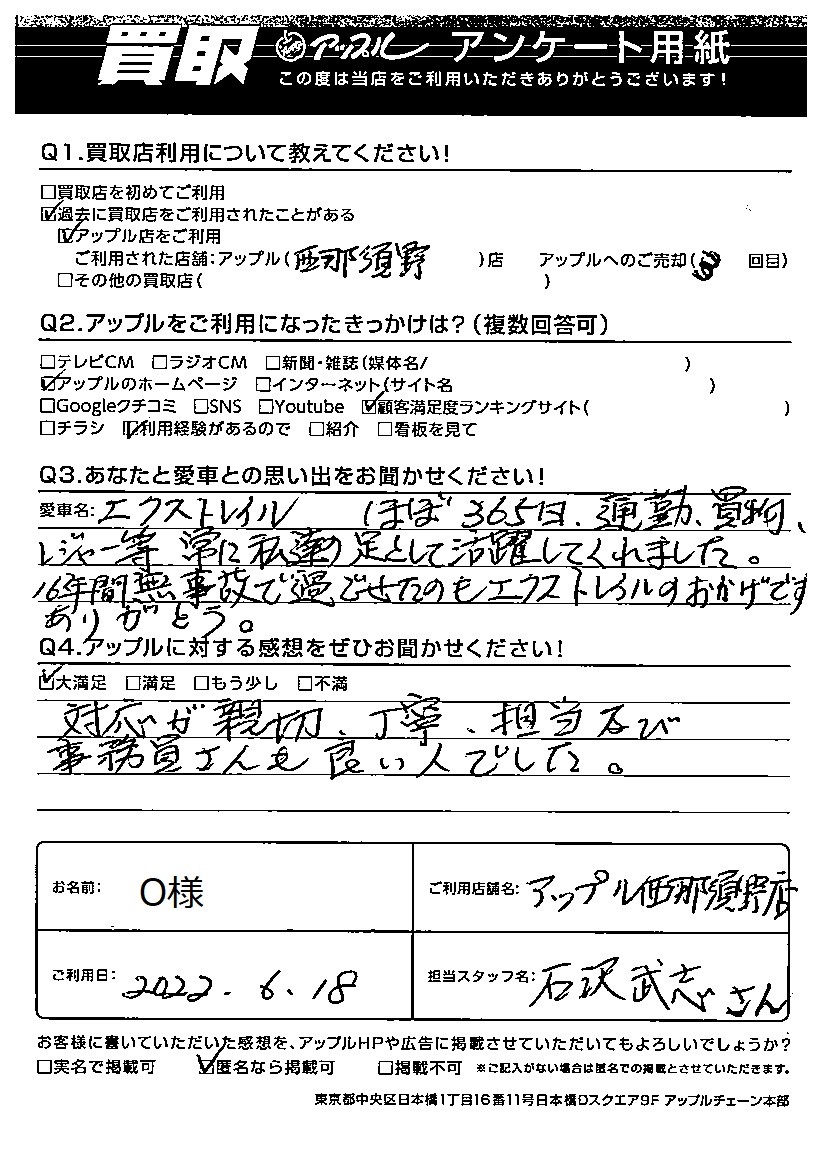 16年間無事故で過ごせたのもエクストレイルのおかげです。ありがとう。