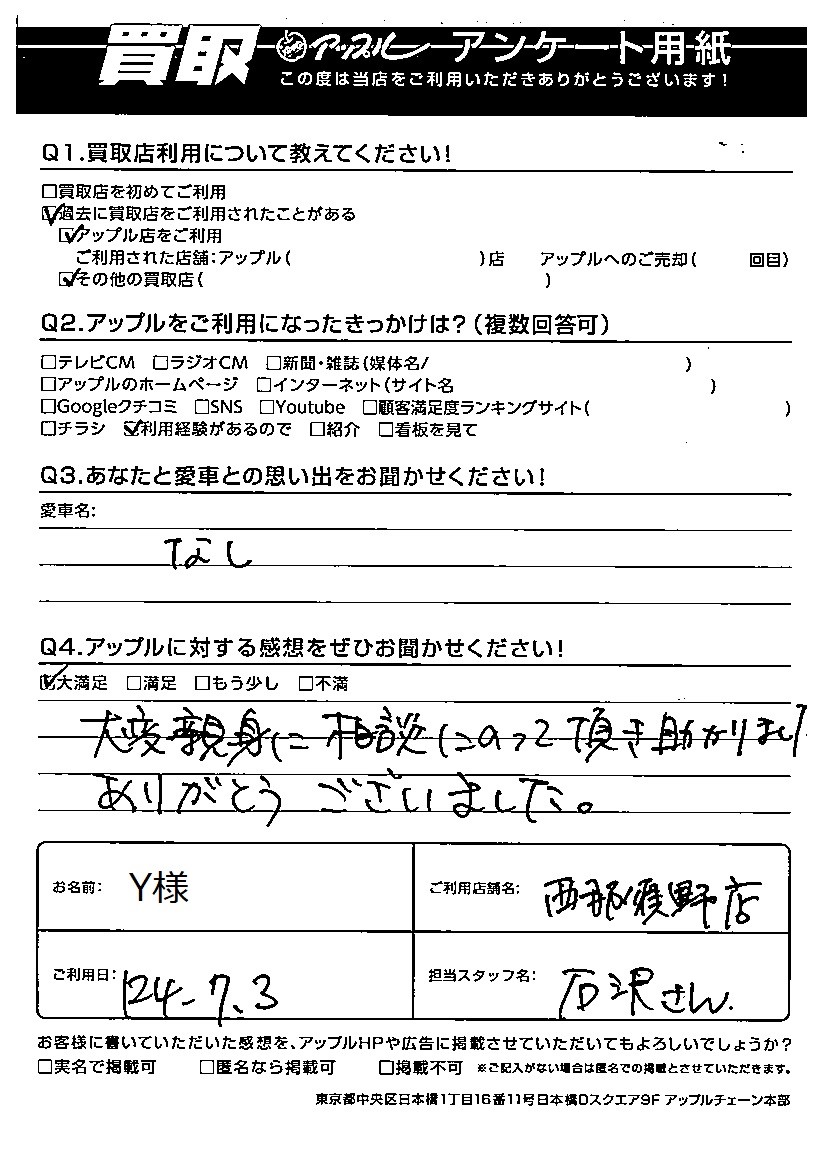 お車のご相談・ 査定だけでもOK! カンタン 入力 30秒 アップルがブランド買取始めました! お電話でも受付中! 受付時間10:00 ~ 19:00 0287-38-0544 お車のご相談・ 査定だけでもOK! カンタン 入力 30秒 アップルがブランド買取始めました! お電話でも受付中! 受付時間10:00 ~ 19:00 0287-38-0544 アップルがブランド買取始めました! お電話でも受付中! 受付時間10:00 ~ 19:00 0287-38-0544 店舗情報 在庫車 スタッフ紹介 ブログ お客様の声 キャンペーン 無料査定 click お客様の声 ご記入日: 2022/07/03 Y様 Qあなたと愛車との思い出をお聞かせください!なしQアップルに対する感想をぜひお聞かせください!『アップルに対する感想』大満足大変親身に相談にのって頂き助かりました。ありがとうございました。 前へ 次へ お客様の声一覧を見る