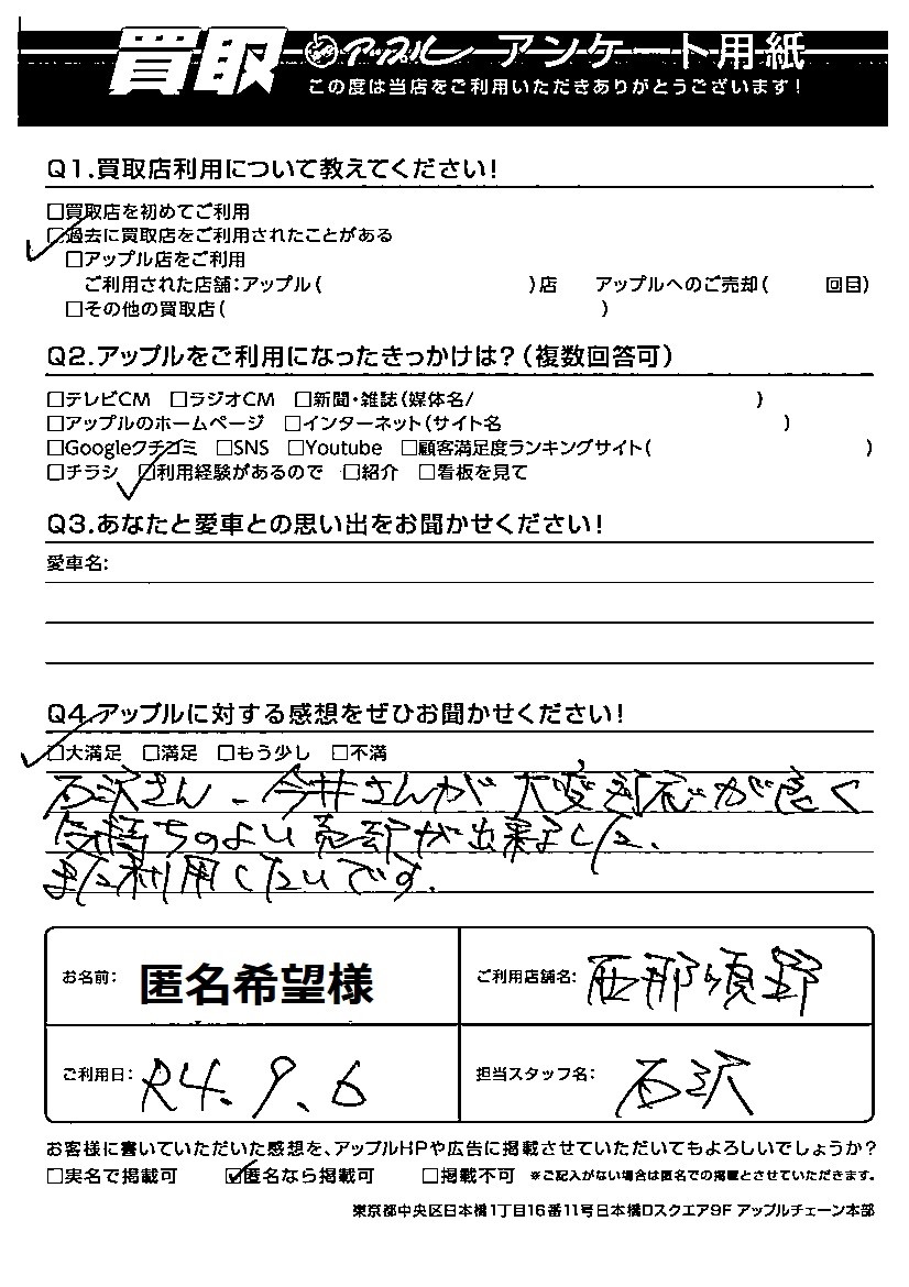 お車のご相談・ 査定だけでもOK! カンタン 入力 30秒 アップルがブランド買取始めました! お電話でも受付中! 受付時間10:00 ~ 19:00 0287-38-0544 お車のご相談・ 査定だけでもOK! カンタン 入力 30秒 アップルがブランド買取始めました! お電話でも受付中! 受付時間10:00 ~ 19:00 0287-38-0544 アップルがブランド買取始めました! お電話でも受付中! 受付時間10:00 ~ 19:00 0287-38-0544 店舗情報 在庫車 スタッフ紹介 ブログ お客様の声 キャンペーン 無料査定 click お客様の声 ご記入日: 2022/09/06 匿名希望様 Q アップルに対する感想をぜひお聞かせください!感想:大満足石沢さん、今井さんが大変対応が良く気持ちのよい売却が出来ました。また利用したいです。 前へ 次へ お客様の声一覧を見る