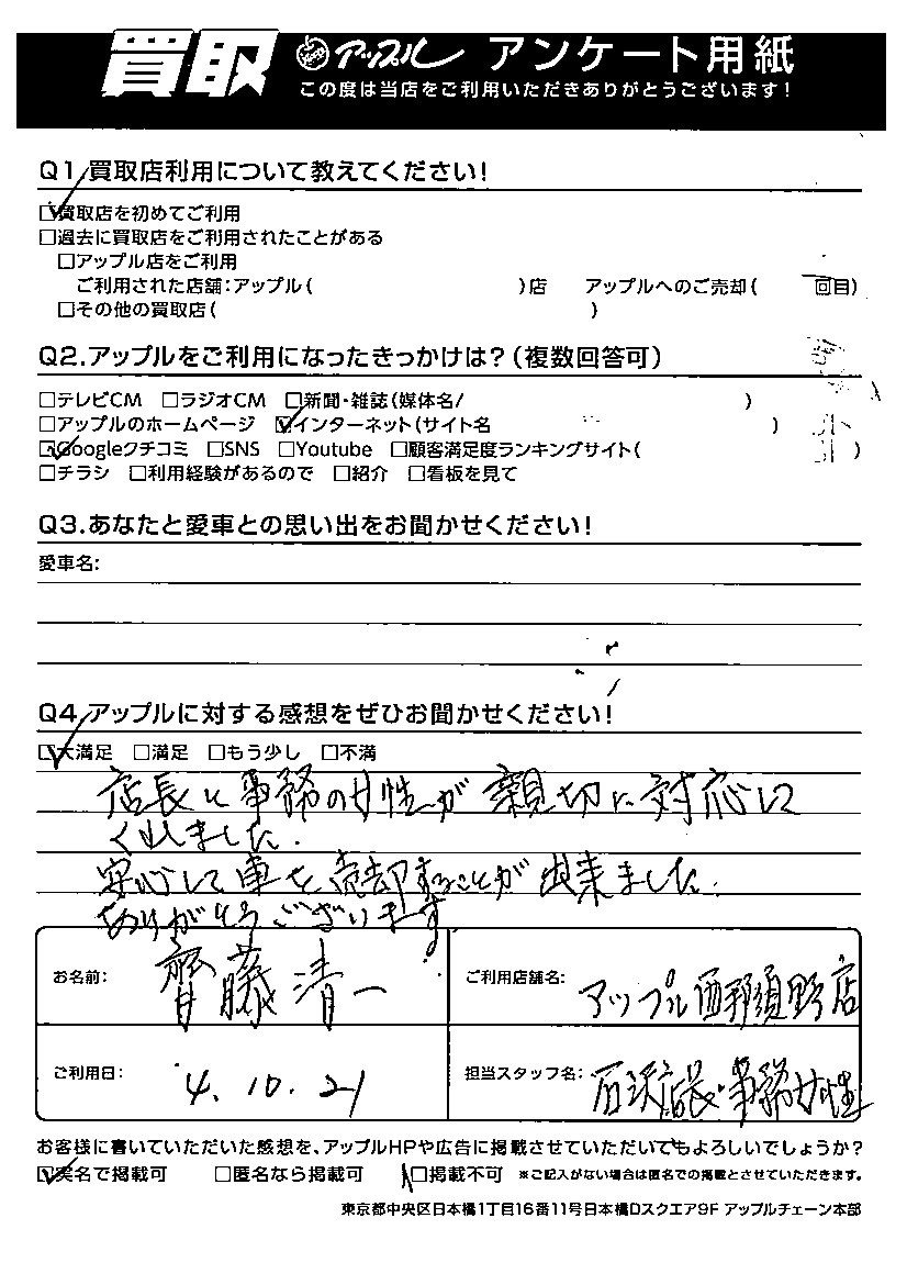 お車のご相談・ 査定だけでもOK! カンタン 入力 30秒 アップルがブランド買取始めました! お電話でも受付中! 受付時間10:00 ~ 19:00 0287-38-0544 お車のご相談・ 査定だけでもOK! カンタン 入力 30秒 アップルがブランド買取始めました! お電話でも受付中! 受付時間10:00 ~ 19:00 0287-38-0544 アップルがブランド買取始めました! お電話でも受付中! 受付時間10:00 ~ 19:00 0287-38-0544 店舗情報 在庫車 スタッフ紹介 ブログ お客様の声 キャンペーン 無料査定 click お客様の声 ご記入日: 2022/10/21 齊藤清一様 Q アップルに対する感想をぜひお聞かせください!感想:大満足店長と事務の女性が親切に対応してくれました。安心して車を売却することが出来ました。ありがとうございます。 前へ 次へ お客様の声一覧を見る
