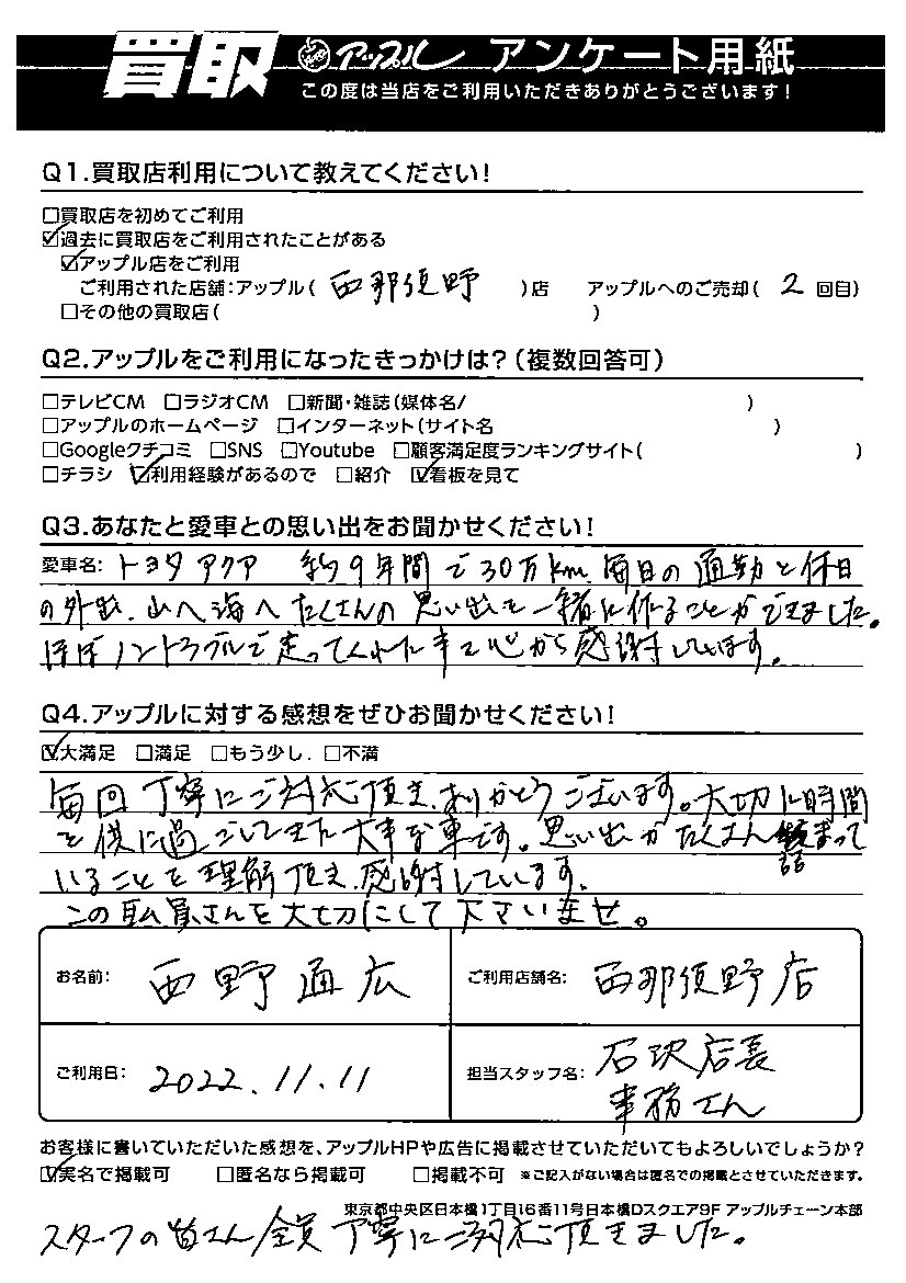 西野通広様 車名:トヨタ アクア