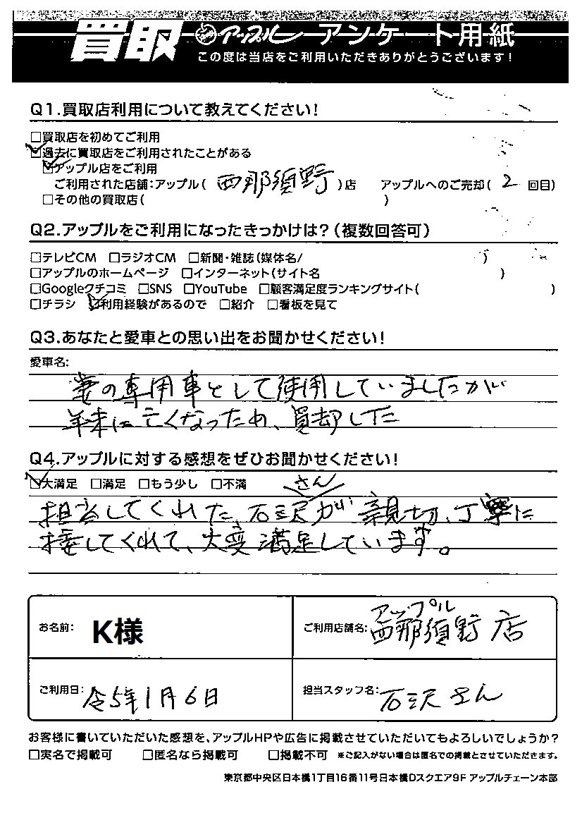 担当してくれた石沢さんが親切、丁寧に接してくれて、大変満足しています。
