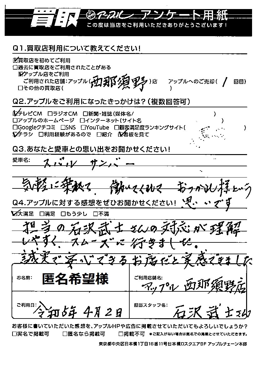 担当の石沢武士さんの対応が理解しやすく、スムーズに行きました。誠実で安心できるお店だと実感できました。