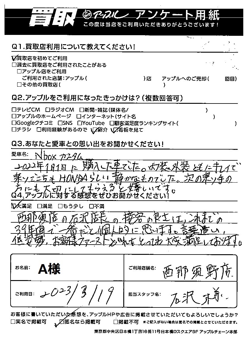 西那須野店の石沢店長の接客の良さはこれまでの39年間で一番だと個人的に思います。言葉遣い、低姿勢、お客様ファーストどれをとっても大変満足しております。