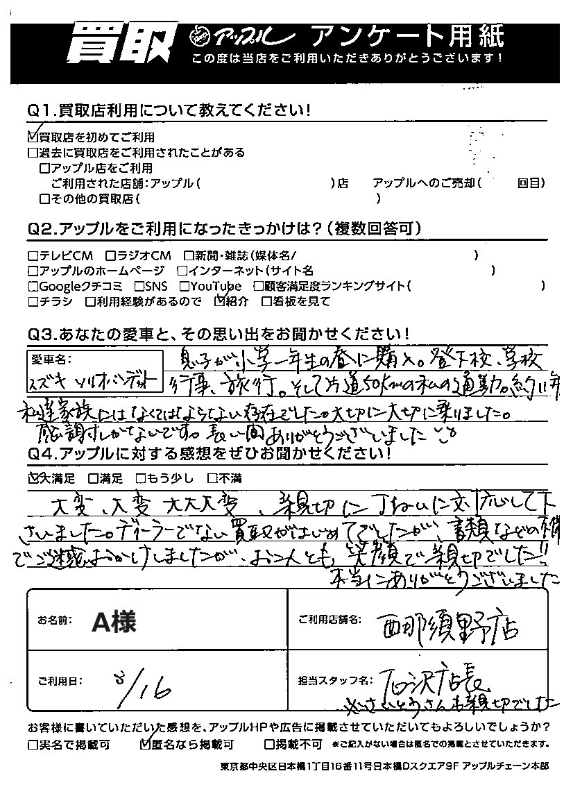 ディーラーでない買取がはじめてでしたが、書類などの不備でご迷惑おかけしましたが、