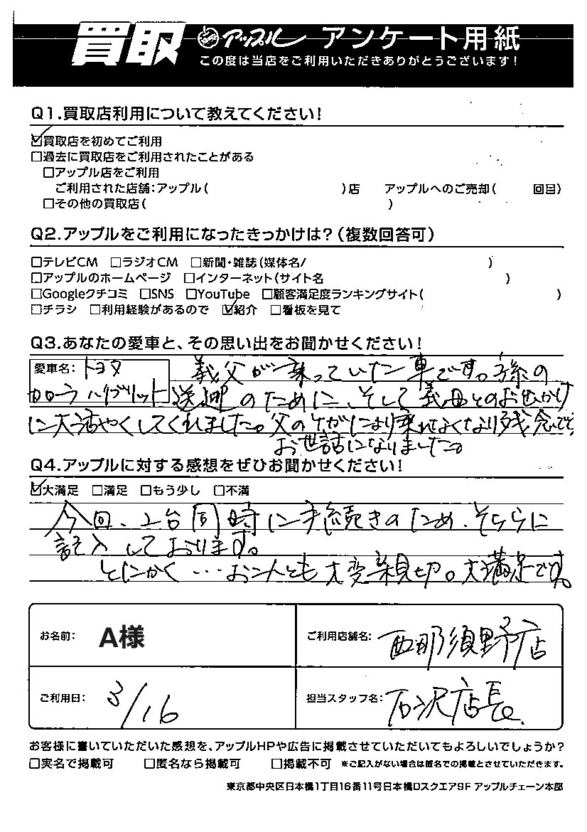 A様 車名:トヨタ カローラアクシオ