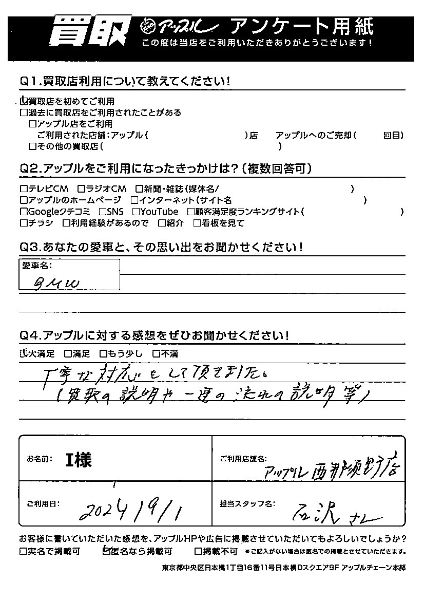 お車のご相談・ 査定だけでもOK! カンタン 入力 30秒 アップルがブランド買取始めました! お電話でも受付中! 受付時間10:00 ~ 19:00 0287-38-0544 お車のご相談・ 査定だけでもOK! カンタン 入力 30秒 アップルがブランド買取始めました! お電話でも受付中! 受付時間10:00 ~ 19:00 0287-38-0544 アップルがブランド買取始めました! お電話でも受付中! 受付時間10:00 ~ 19:00 0287-38-0544 店舗情報 在庫車 スタッフ紹介 ブログ お客様の声 キャンペーン 無料査定 click お客様の声 ご記入日: 2024/09/01 I様 車名:BMW 1シリーズ Q あなたと愛車との思い出をお聞かせください!Q アップルに対する感想をぜひお聞かせください!感想:大満足 丁寧な対応をして頂きました。(買取の説明や一連の流れの説明等) 前へ 次へ お客様の声一覧を見る