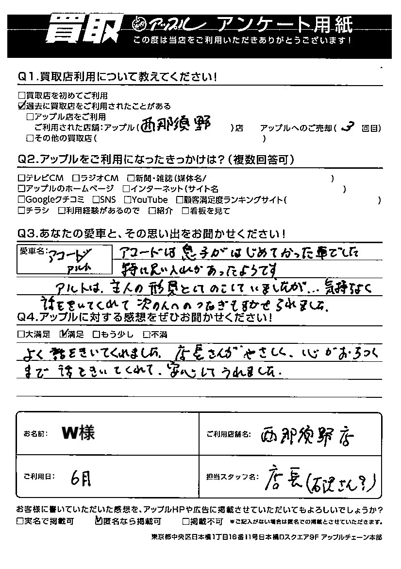 W様 車名:ホンダ アコードセダン(H28年5月~のHYBRID含む)