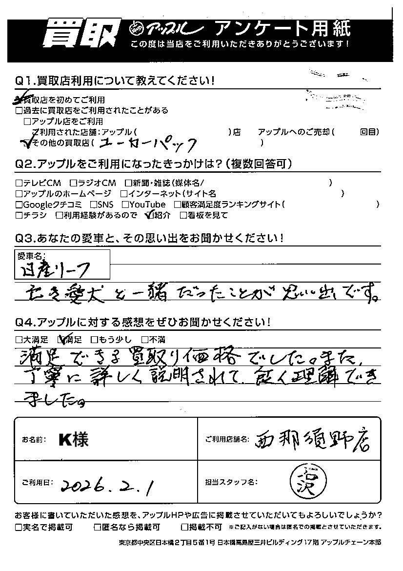 K様 車名:日産 リーフ