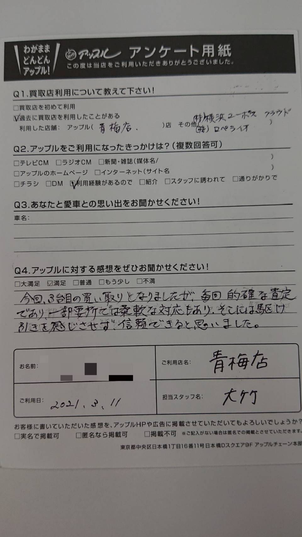 お車のご相談・ 査定だけでもOK! カンタン 入力 30秒 アップルがブランド買取始めました! お電話でも受付中! 受付時間10:00 ~ 19:00 0120-78-6610 お車のご相談・ 査定だけでもOK! カンタン 入力 30秒 アップルがブランド買取始めました! お電話でも受付中! 受付時間10:00 ~ 19:00 0120-78-6610 アップルがブランド買取始めました! お電話でも受付中! 受付時間10:00 ~ 19:00 0120-78-6610 店舗情報 在庫車 スタッフ紹介 ブログ お客様の声 キャンペーン 無料査定 click お客様の声 ご記入日: 2021/03/11 匿名希望様 車名:ミニ ミニクロスオーバー 今回、3台目の買い取りとなりましたが、毎回的確な査定であり、一部要所では柔軟な対応もあり、そこは駆け引きを感じさせず、信頼できると思いました。 前へ 次へ お客様の声一覧を見る