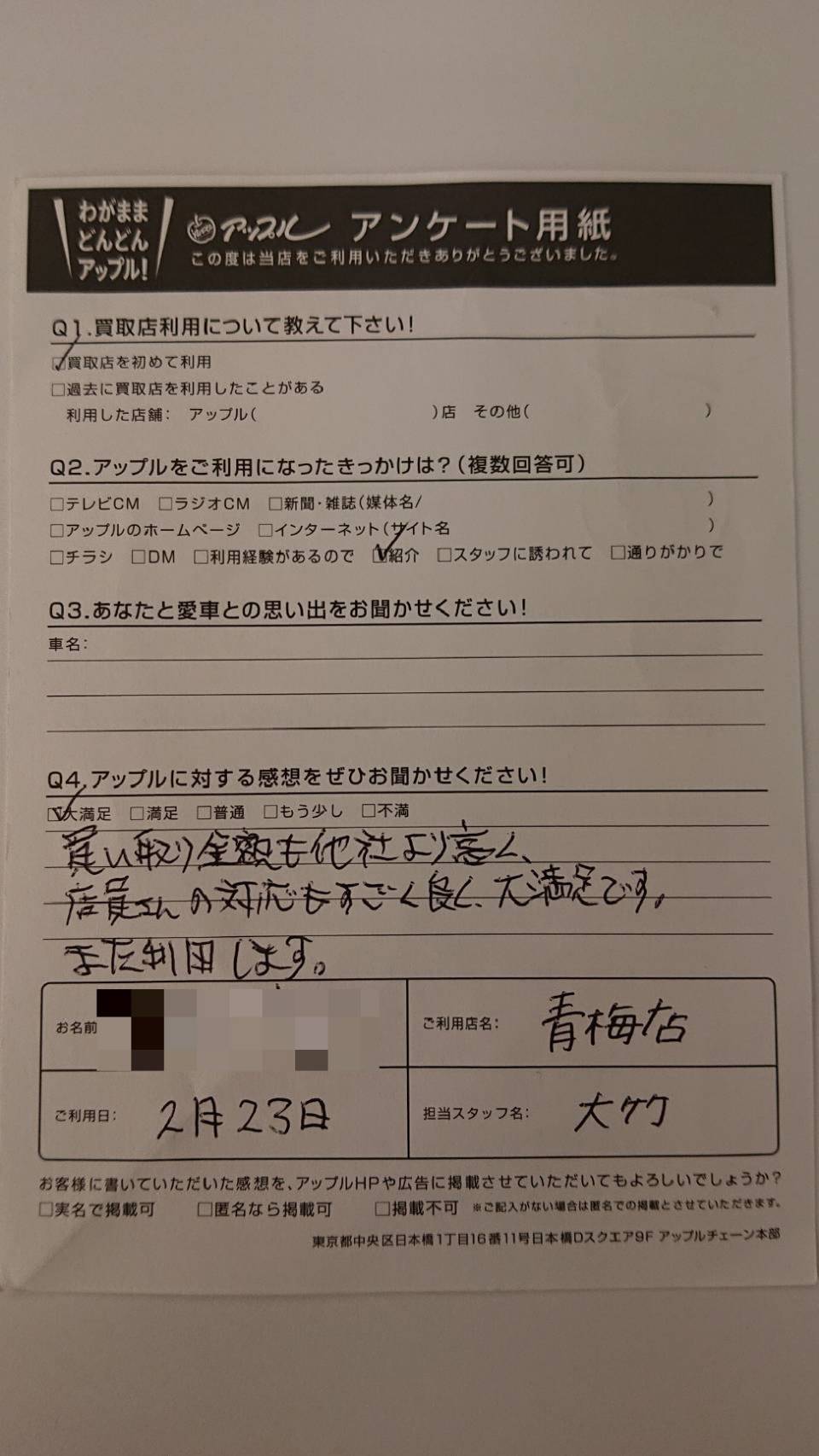 お車のご相談・ 査定だけでもOK! カンタン 入力 30秒 アップルがブランド買取始めました! お電話でも受付中! 受付時間10:00 ~ 19:00 0120-78-6610 お車のご相談・ 査定だけでもOK! カンタン 入力 30秒 アップルがブランド買取始めました! お電話でも受付中! 受付時間10:00 ~ 19:00 0120-78-6610 アップルがブランド買取始めました! お電話でも受付中! 受付時間10:00 ~ 19:00 0120-78-6610 店舗情報 在庫車 スタッフ紹介 ブログ お客様の声 キャンペーン 無料査定 click お客様の声 ご記入日: 2021/02/23 匿名希望様 車名:トヨタ カムリ 買い取り金額も他社より高く、店員さんの対応もすごく良く、大満足です。また利用します。 前へ 次へ お客様の声一覧を見る