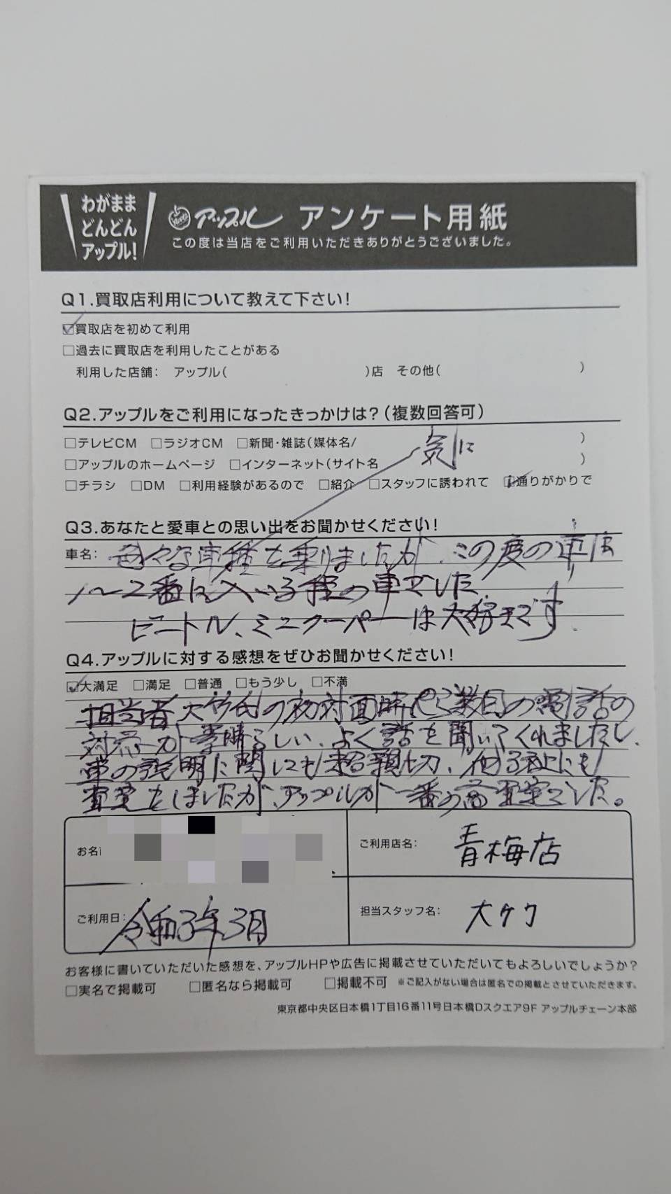 車の説明に関しても超親切、他3社にも査定をしましたがアップルが一番の高査定でした。