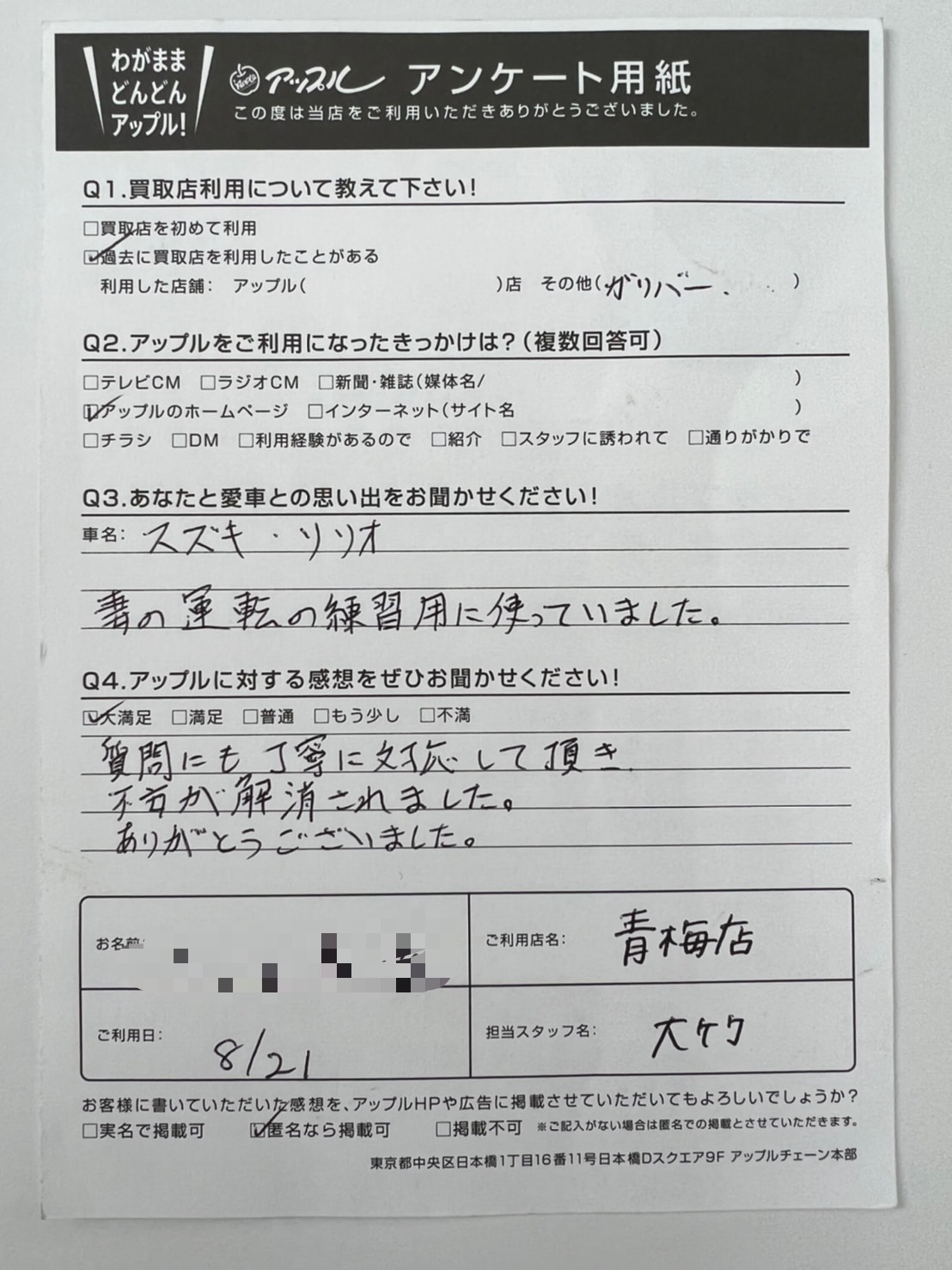 お車のご相談・ 査定だけでもOK! カンタン 入力 30秒 アップルがブランド買取始めました! お電話でも受付中! 受付時間10:00 ~ 19:00 0120-78-6610 お車のご相談・ 査定だけでもOK! カンタン 入力 30秒 アップルがブランド買取始めました! お電話でも受付中! 受付時間10:00 ~ 19:00 0120-78-6610 アップルがブランド買取始めました! お電話でも受付中! 受付時間10:00 ~ 19:00 0120-78-6610 店舗情報 在庫車 スタッフ紹介 ブログ お客様の声 キャンペーン 無料査定 click お客様の声 ご記入日: 2021/08/21 匿名希望様 車名:スズキ ソリオ 妻の運転の練習用に使っていました。質問にも丁寧に対応して頂き不安が解消されました。ありがとうございました。 前へ 次へ お客様の声一覧を見る