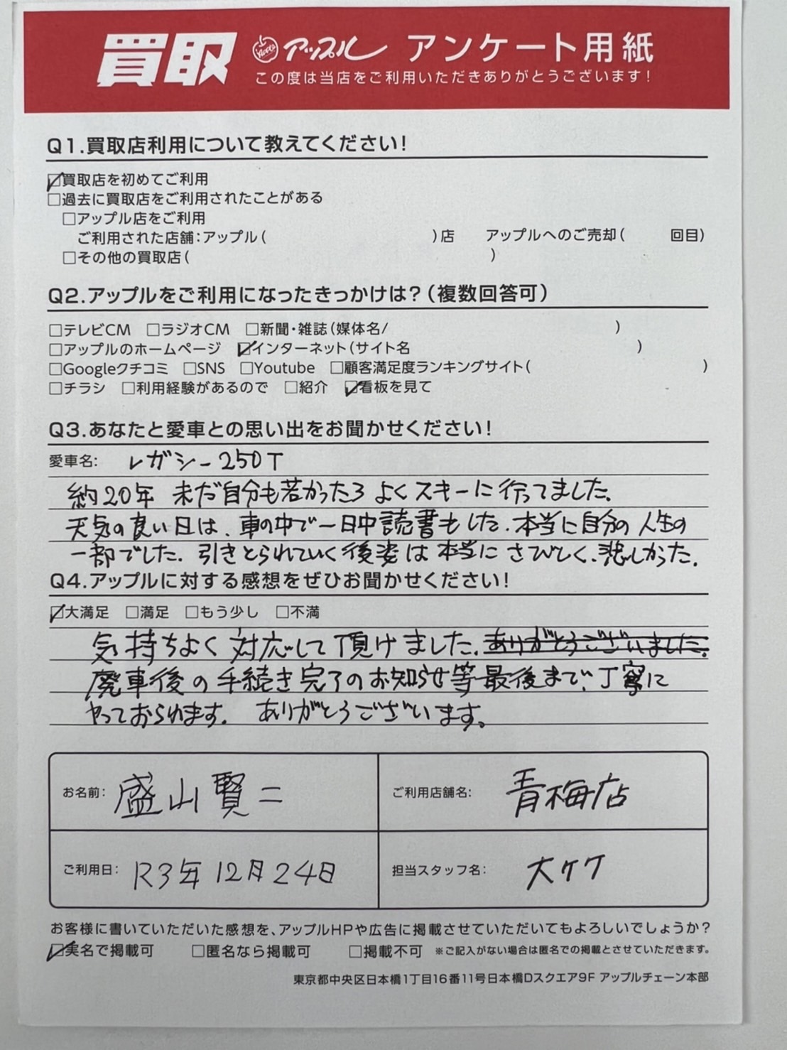 盛山 賢二様 車名:スバル レガシィツーリングワゴン