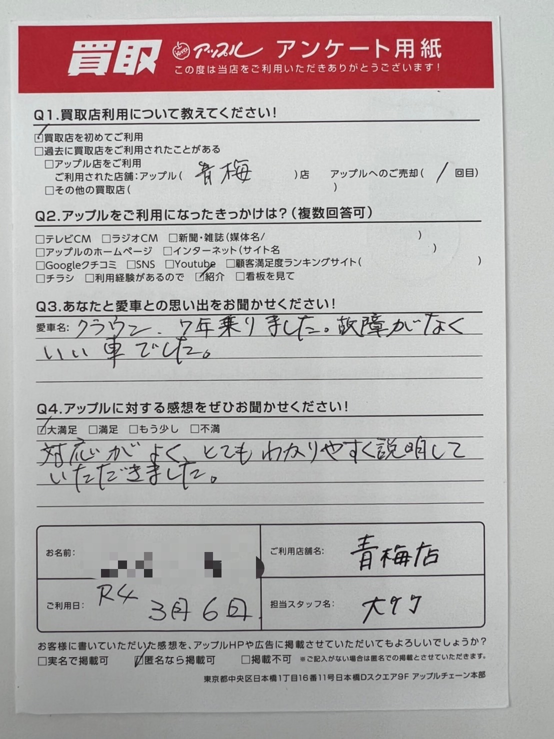 お車のご相談・ 査定だけでもOK! カンタン 入力 30秒 アップルがブランド買取始めました! お電話でも受付中! 受付時間10:00 ~ 19:00 0120-78-6610 お車のご相談・ 査定だけでもOK! カンタン 入力 30秒 アップルがブランド買取始めました! お電話でも受付中! 受付時間10:00 ~ 19:00 0120-78-6610 アップルがブランド買取始めました! お電話でも受付中! 受付時間10:00 ~ 19:00 0120-78-6610 店舗情報 在庫車 スタッフ紹介 ブログ お客様の声 キャンペーン 無料査定 click お客様の声 ご記入日: 2022/06/12 匿名希望様 車名:トヨタ クラウン(~H11年8月/H30年6月~) ご利用日 2022-03-067年乗りました。故障がなくいい車でした。対応がよく、とてもわかりやすく説明していただきました。 前へ 次へ お客様の声一覧を見る