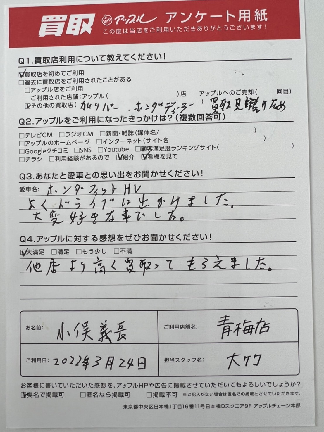 お車のご相談・ 査定だけでもOK! カンタン 入力 30秒 アップルがブランド買取始めました! お電話でも受付中! 受付時間10:00 ~ 19:00 0120-78-6610 お車のご相談・ 査定だけでもOK! カンタン 入力 30秒 アップルがブランド買取始めました! お電話でも受付中! 受付時間10:00 ~ 19:00 0120-78-6610 アップルがブランド買取始めました! お電話でも受付中! 受付時間10:00 ~ 19:00 0120-78-6610 店舗情報 在庫車 スタッフ紹介 ブログ お客様の声 キャンペーン 無料査定 click お客様の声 ご記入日: 2022/06/12 匿名希望様 車名:ホンダ フィットハイブリッド(~H25年9月) ご利用日 2022-03-24よくドライブに出かけました。大変好きな車でした。他店より高く買取ってもらえました。 前へ 次へ お客様の声一覧を見る