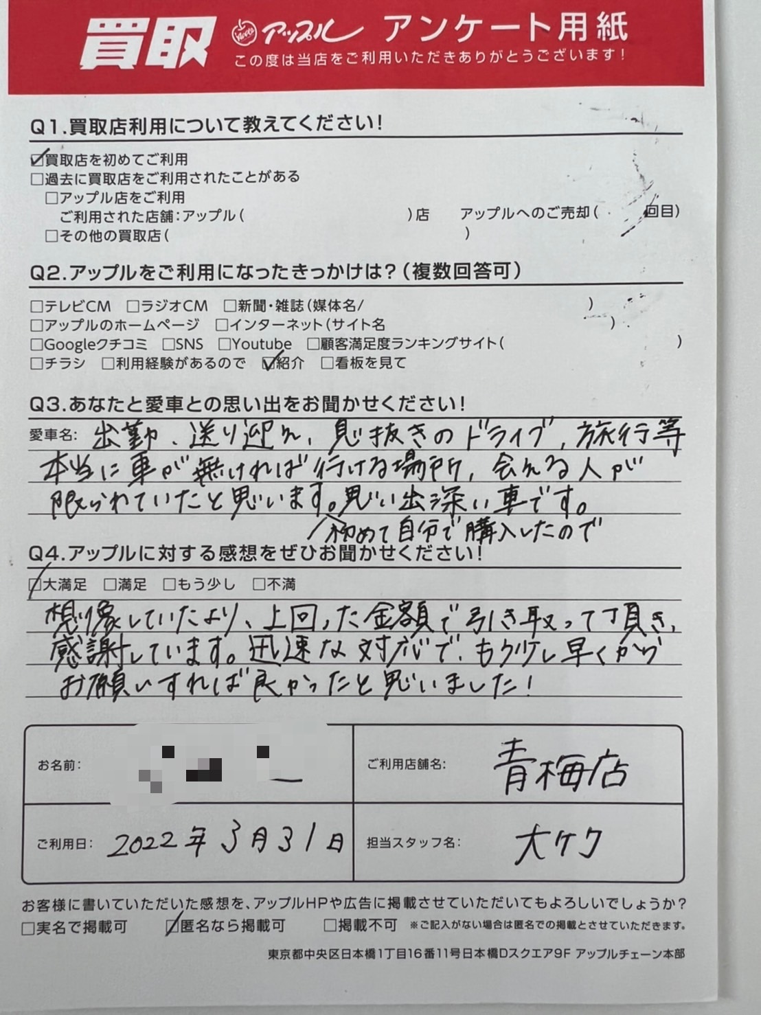 想像していたより、上回った金額で引き取って頂き、