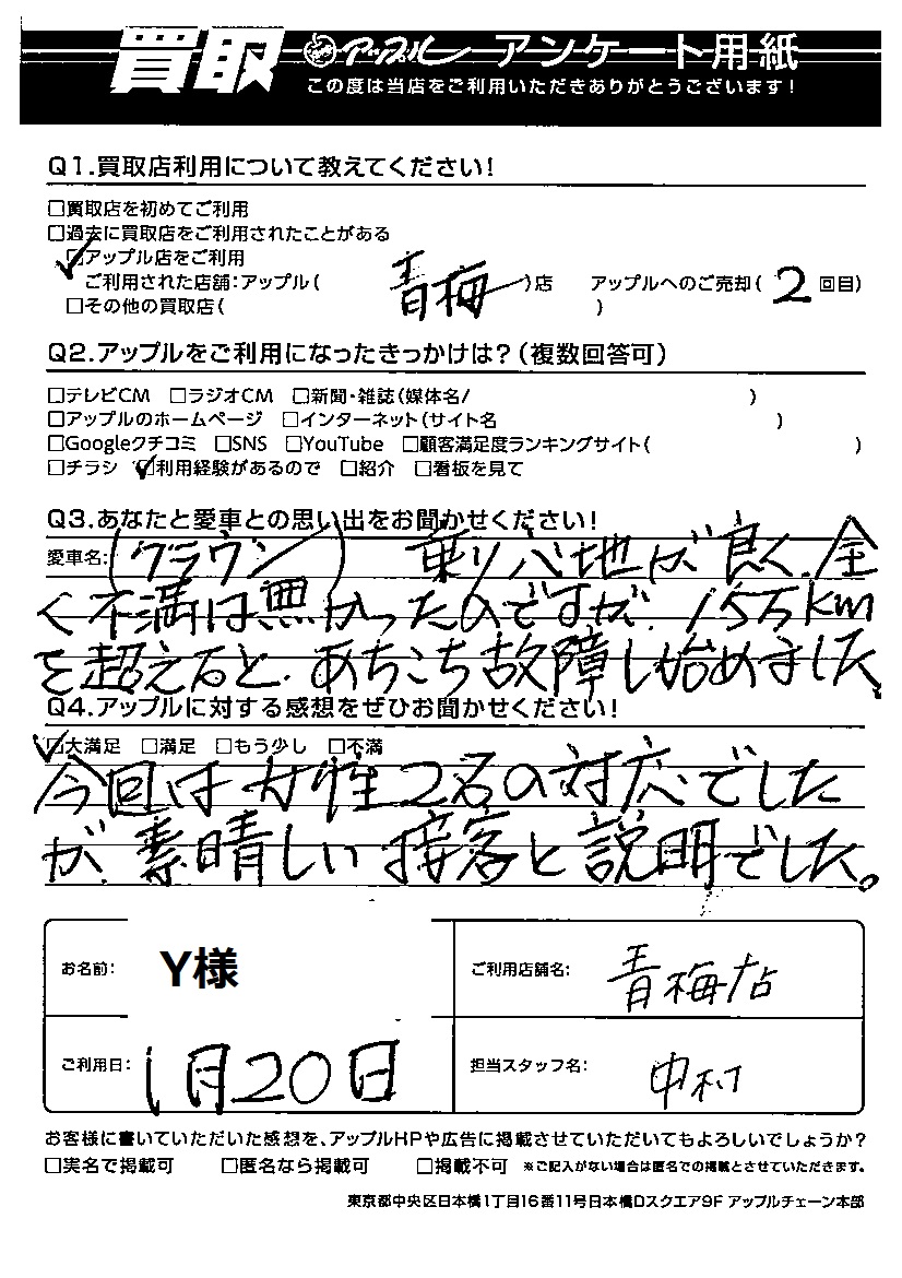 Y様 車名:トヨタ クラウン(~H11年8月/H30年6月~)